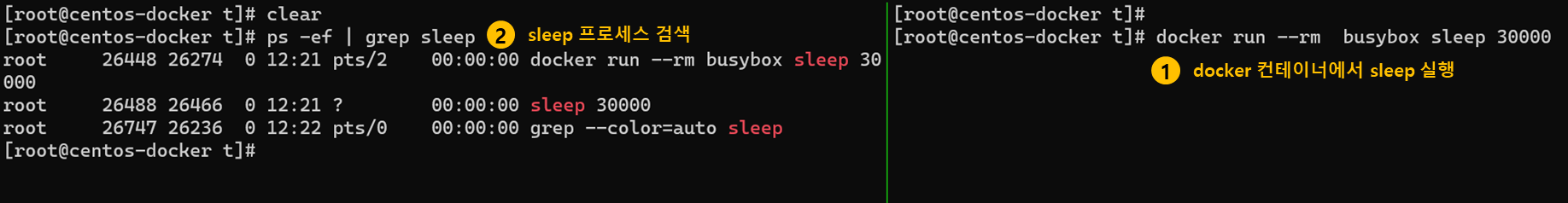 sleep을 실행하는 도커 컨테이너를 실행합니다. 그리고 host에서 sleep프로세스를 실행하는 도커 컨테이너가 리눅스 프로세스로 보입니다.