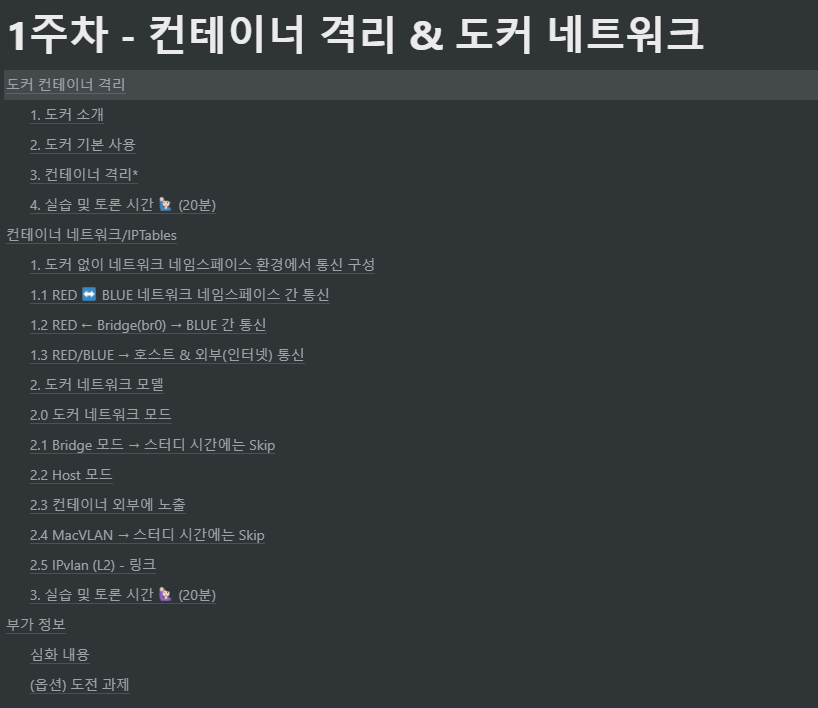 1주차 첫번째 주제는 컨테이너 격리를 이해하는 시간을 가졌습니다. 스터디 진행 목차는 아래 그림과 같습니다.