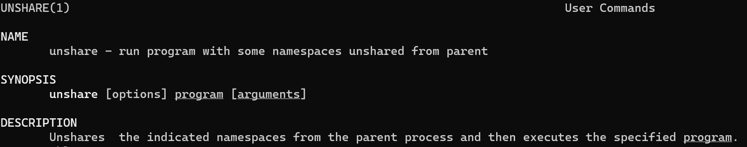 리눅스는 프로세스를 실행할 때 네임스페이스를 설정할 수 있는 명령어를 제공합니다. 명령어 중 한개가 unshare명령어입니다.