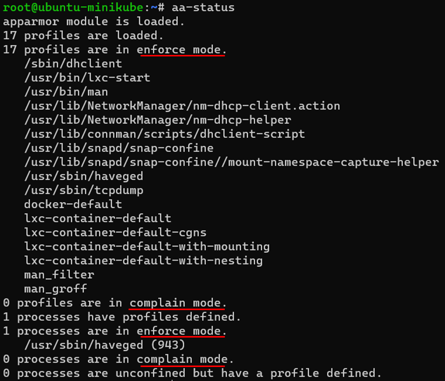 aa-status는 enforce, complain, unconfined 모드에 있는 프로파일을 조회합니다.