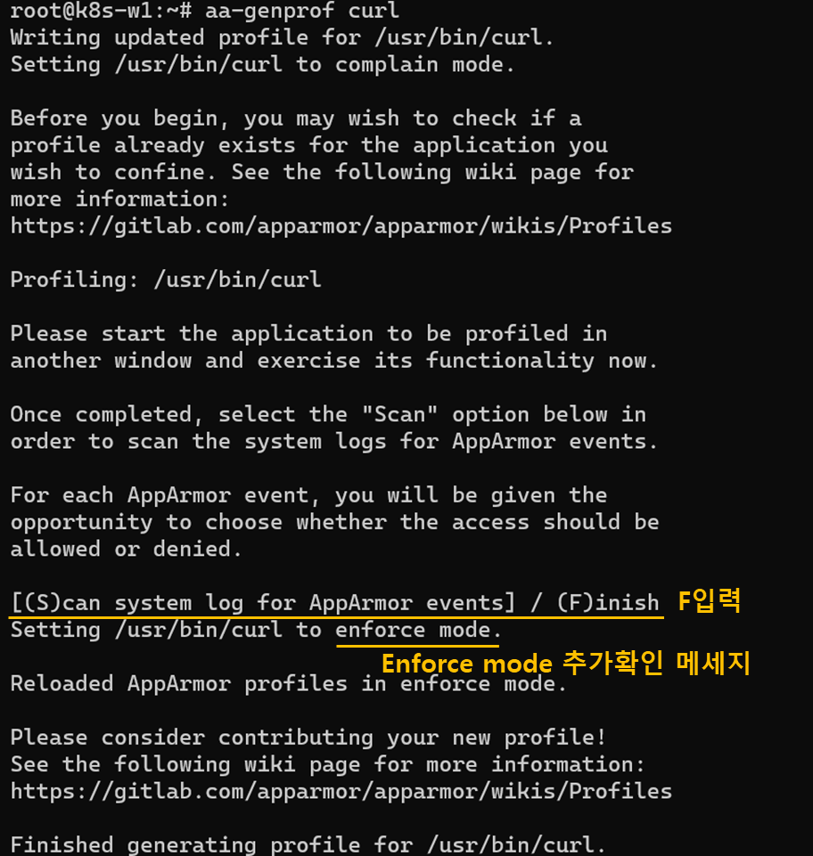 aa-genprof명령어를 이용하여 enforce모드 프로파일을 생성합니다. 중간에 입력 프롬프트를 대기하는데 F를 눌러 Finish옵션을 선택합니다.