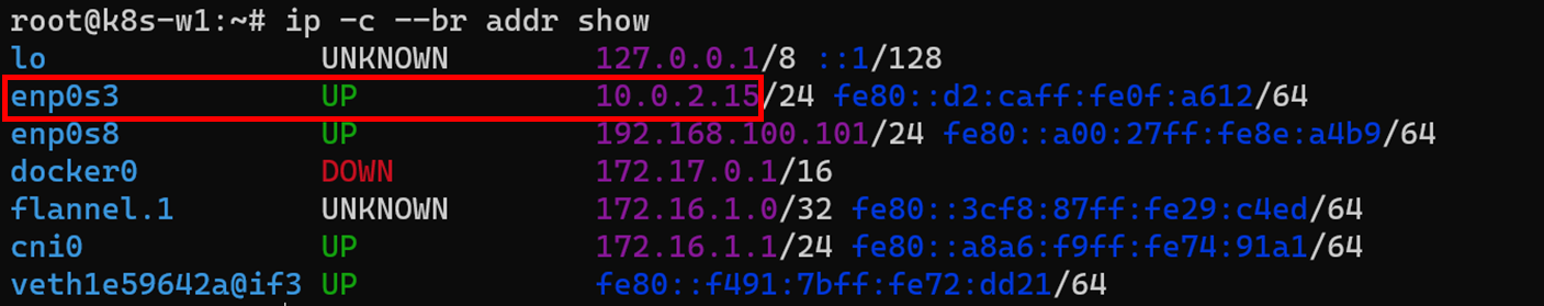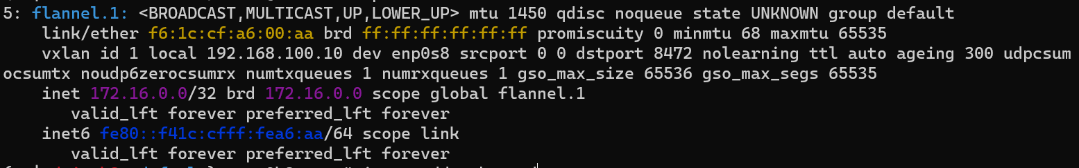 각 노드의 flannet.1인터페이스 네트워크 대역은 ip명령어로 확인할 수 있습니다.