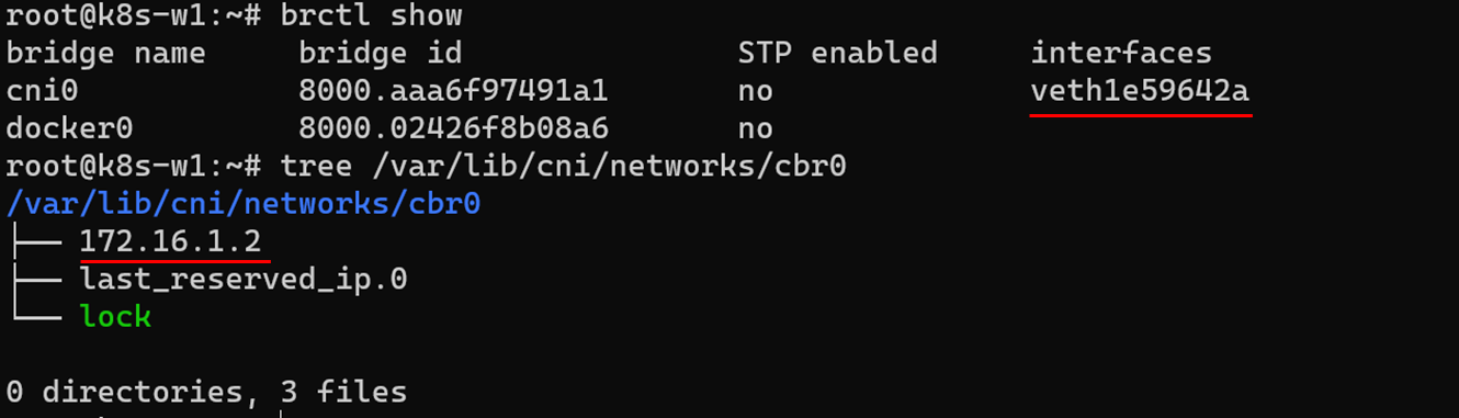 cni(가상브릿지)관점에서는 새로 생성된 pod의 인터페이스가 연결되어 있습니다. 연결된 인터페이스는 brctl명령어로 확인할 수 있고 연결된 IP 는 cbr0디렉터리에서 확인할 수 있습니다.