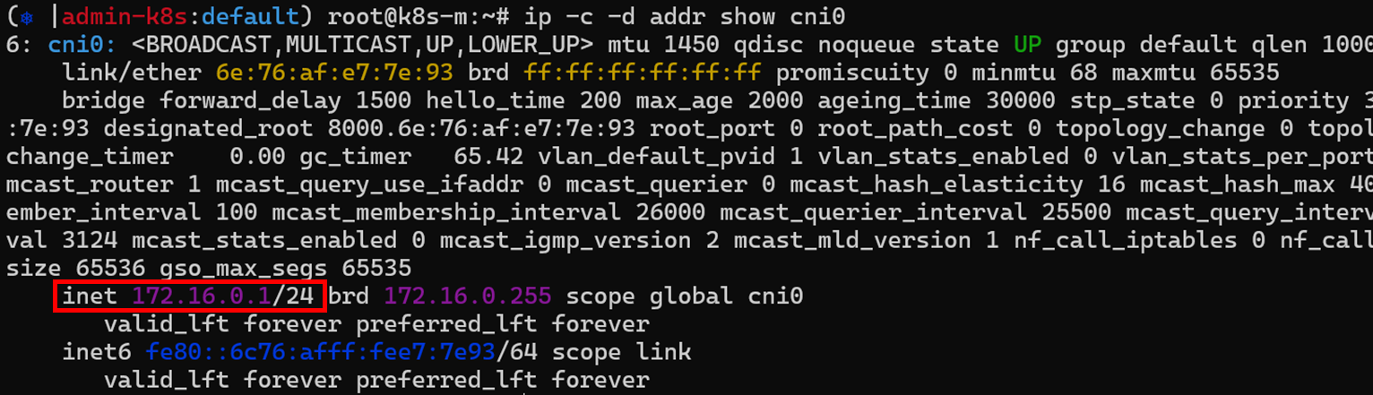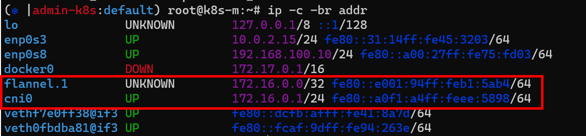 cni인터페이스는 pod끼리 통신하기 위한 가상 브릿지역할을 담당합니다. IP대역은 flannel.1에 영향을 받습니다. cni인터페이스는 pod가 1번이라도 생성되야 자동으로 생성됩니다.