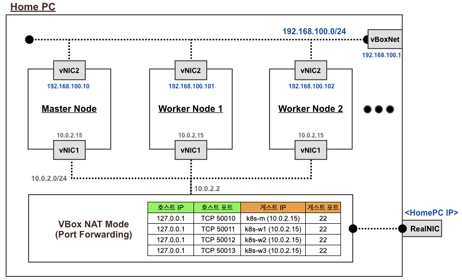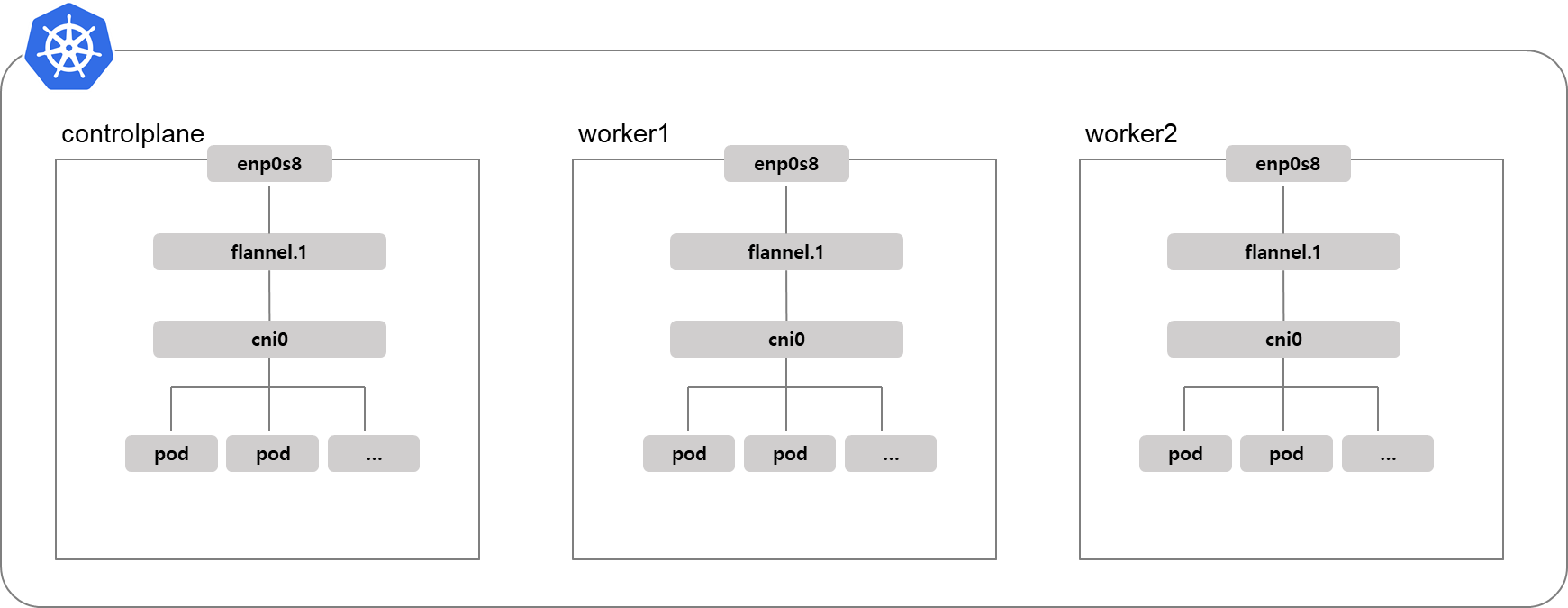 각 노드는 아래처럼 네트워크 구조를 가집니다. enp0s8은 노드가 가지고 있는 물리 인터페이스입니다.