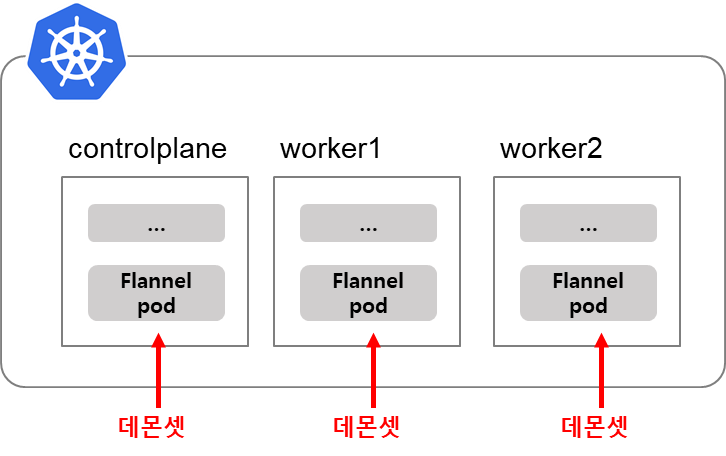 Flannel 네트워크 모델은 데몬셋으로 실행됩니다. 노드 갯수만큼 flannel pod가 실행됩니다.