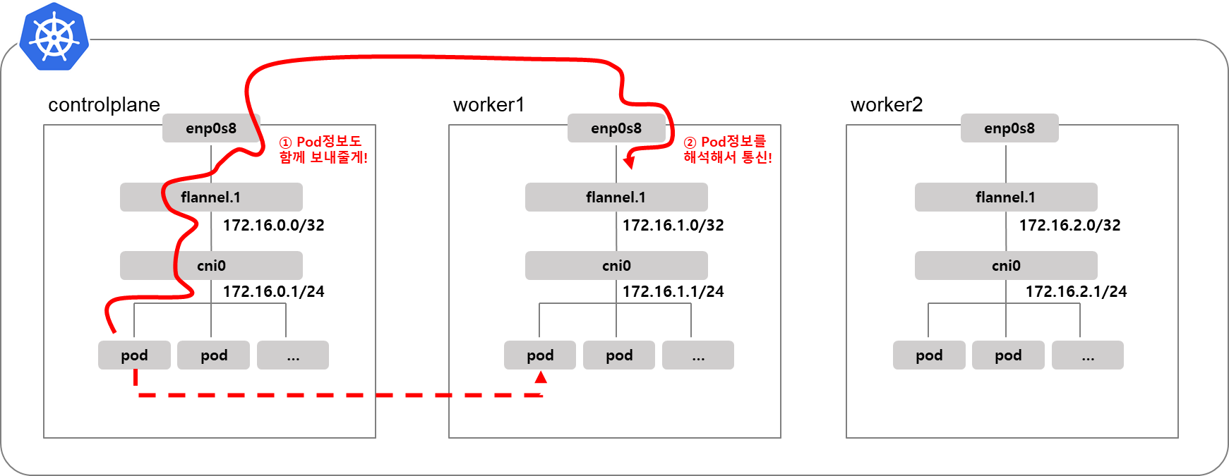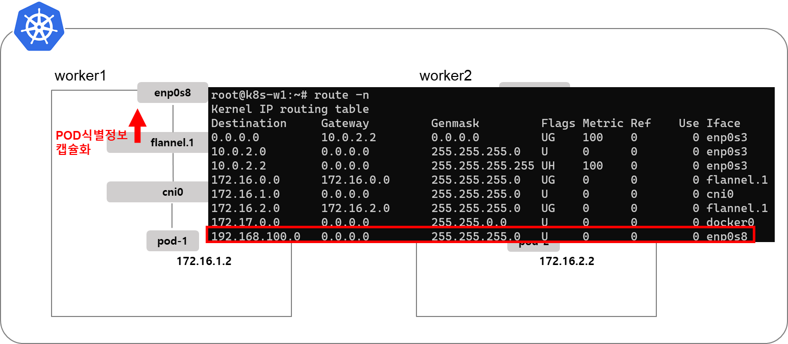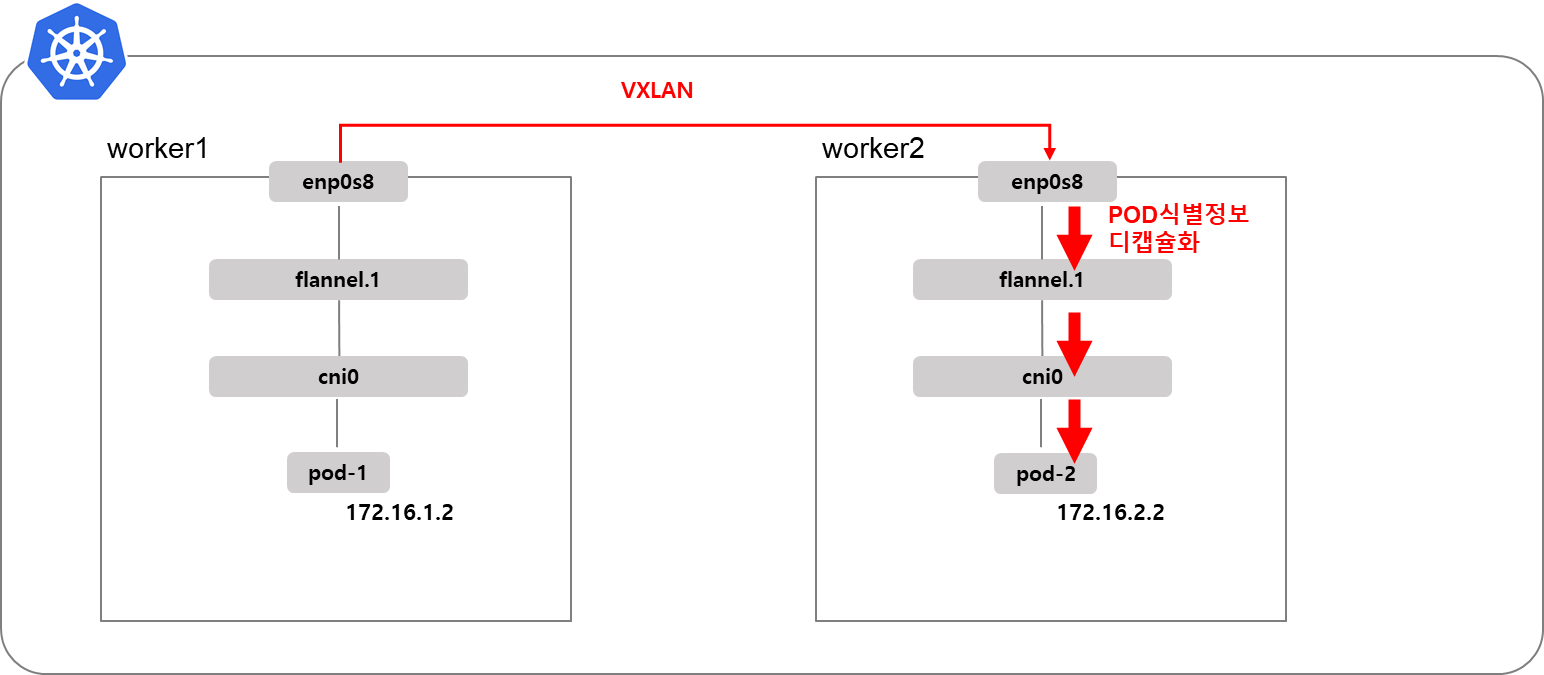 다른 노드에 있는 pod와 통신하기 위해서 VXLAN을 사용합니다. VXLAN은 Flannel인터페이스를 이용해서 UDP프로토콜로 출발지, 도착지 pod식별정보(IP 등)을 캡슐화&디캡슐화합니다.