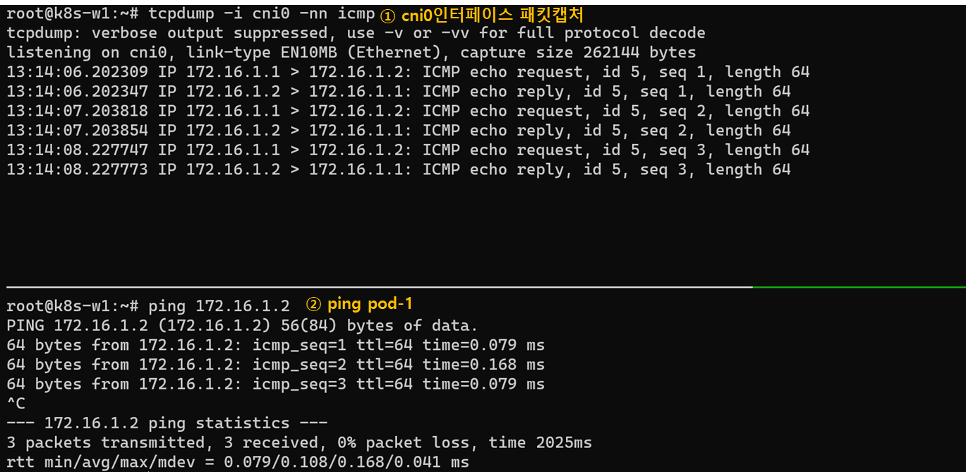 화면을 분할하고 tcpdump로 ICMP패킷을 캡처합니다. 그리고 pod-1 IP인 172.16.1.2에게 ping을 실행하면 172.16.1.1(cni0) <-> 172.168.1.2(pod-1)간 ICMP패킷이 주고받고하는 것을 확인할 수 있습니다.