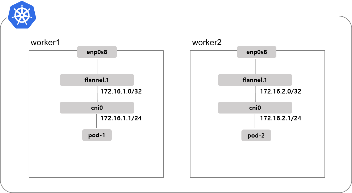 각 flannel.1인터페이스는 노드의 네트워크 대역을 설정합니다. 노드 네트워크 대역은 flannel을 설치할 때 FLANNEL_NETWORK필드 값을 따릅니다.
