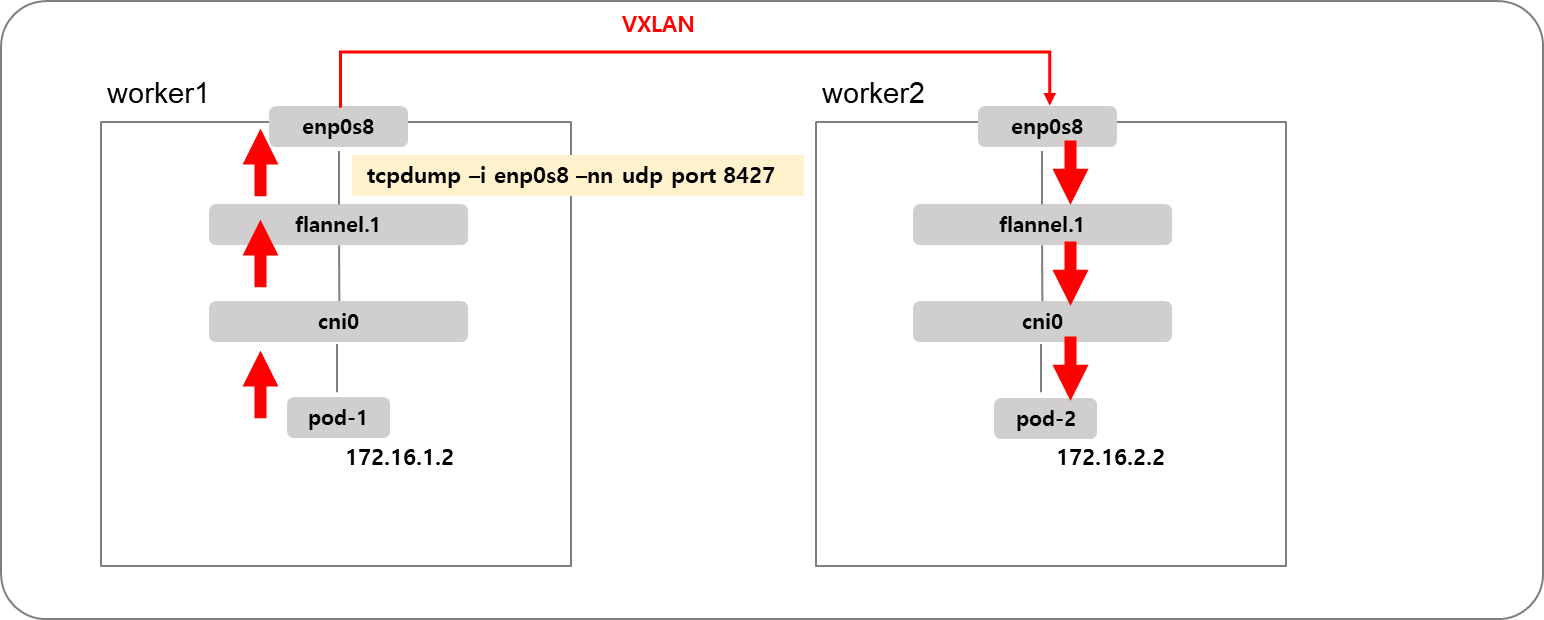 flannel.1인터페이스 입장에서는 (아마도 flannel 데몬셋이 제어) 다른 노드로 가는 패킷이므로 enp0s8인터페이스로 패킷을 전달합니다. 이때, VXLAN이 적용되어 POD식별정보가 UDP패킷으로 캡슐화됩니다.