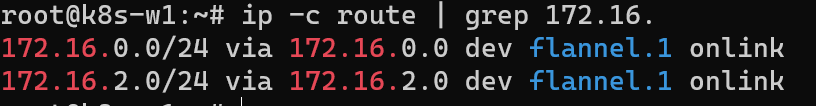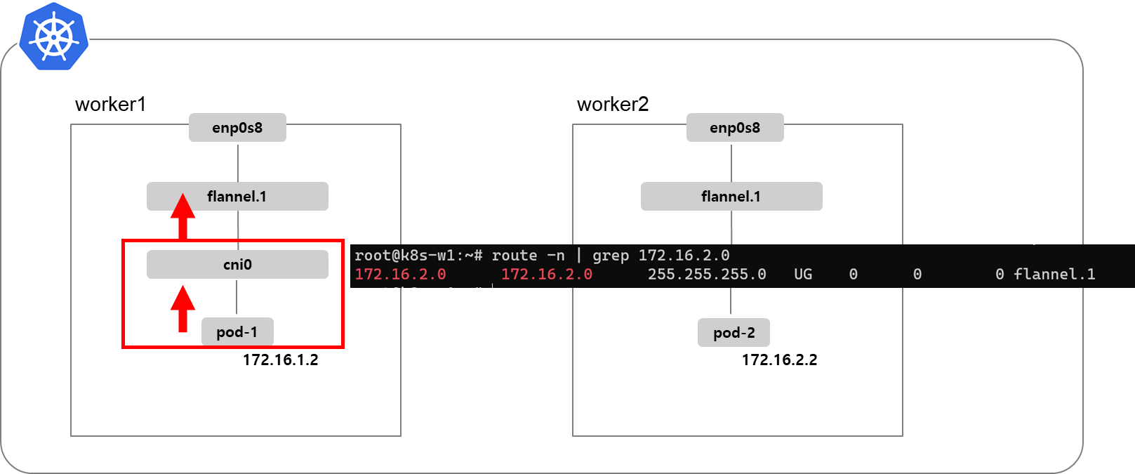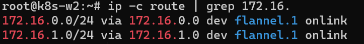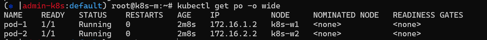 pod-1은 worker1노드에 생성되었으므로 172.16.1.0/24 네트워크 대역 IP를 갖습니다. pod-2는 worker노드에 생성되었으므로 172.16.2.0/24 네트워크 대역 IP를 갖습니다.