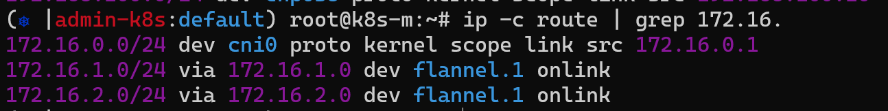 pod가 다른 노드의 pod로 통신하기 위한 라우팅 테이블이 설정되어 있습니다. 다른 노드로 라우팅될 때 flannel.1 인터페이스를 거쳐가는 것을 확인할 수 있습니다. pod 자신 네트워크 대역은 cni0 인터페이스를 거쳐갑니다.