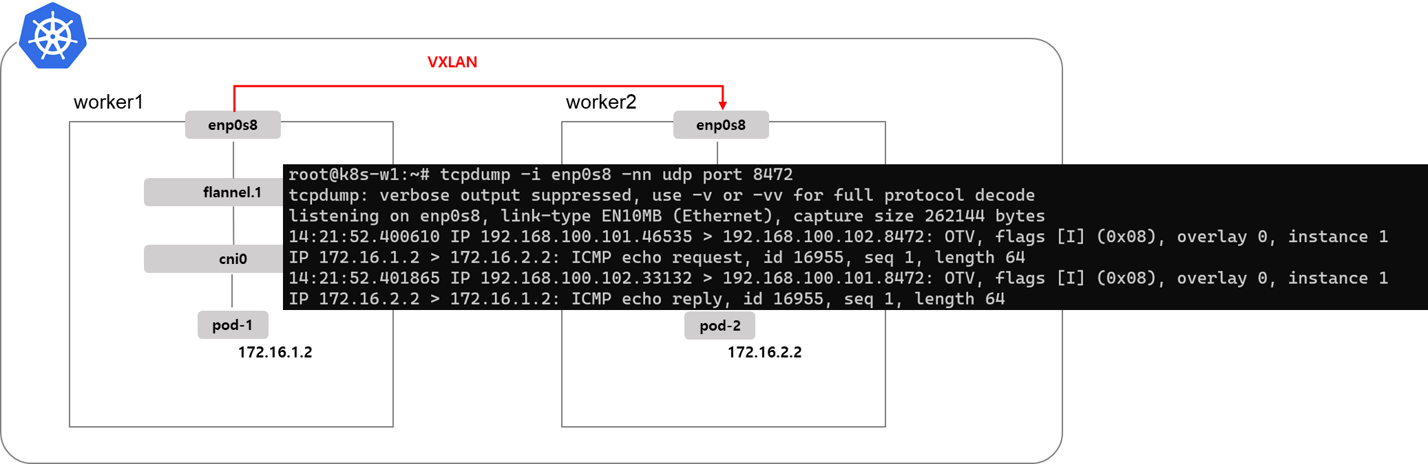 flannel.1인터페이스 입장에서는 (아마도 flannel 데몬셋이 제어) 다른 노드로 가는 패킷이므로 enp0s8인터페이스로 패킷을 전달합니다. 이때, VXLAN이 적용되어 POD식별정보가 UDP패킷으로 캡슐화됩니다.