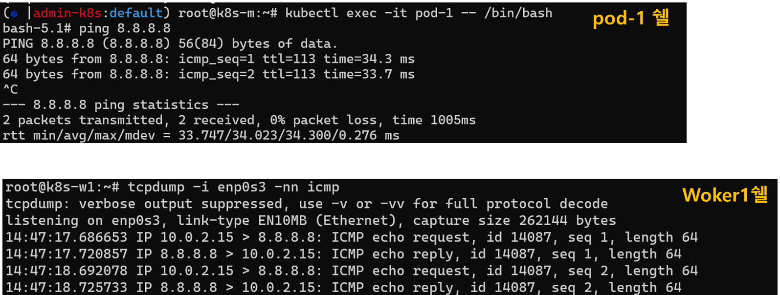 enp0s3에 tcpdump를 실행하고 pod-1에서 구글서버에 ping을 날리면, tcpdump에서 패킷이 캡처됩니다. 즉, host enp0s3인터페이스를 이용해서 pod가 외부와 통신하고 있습니다.