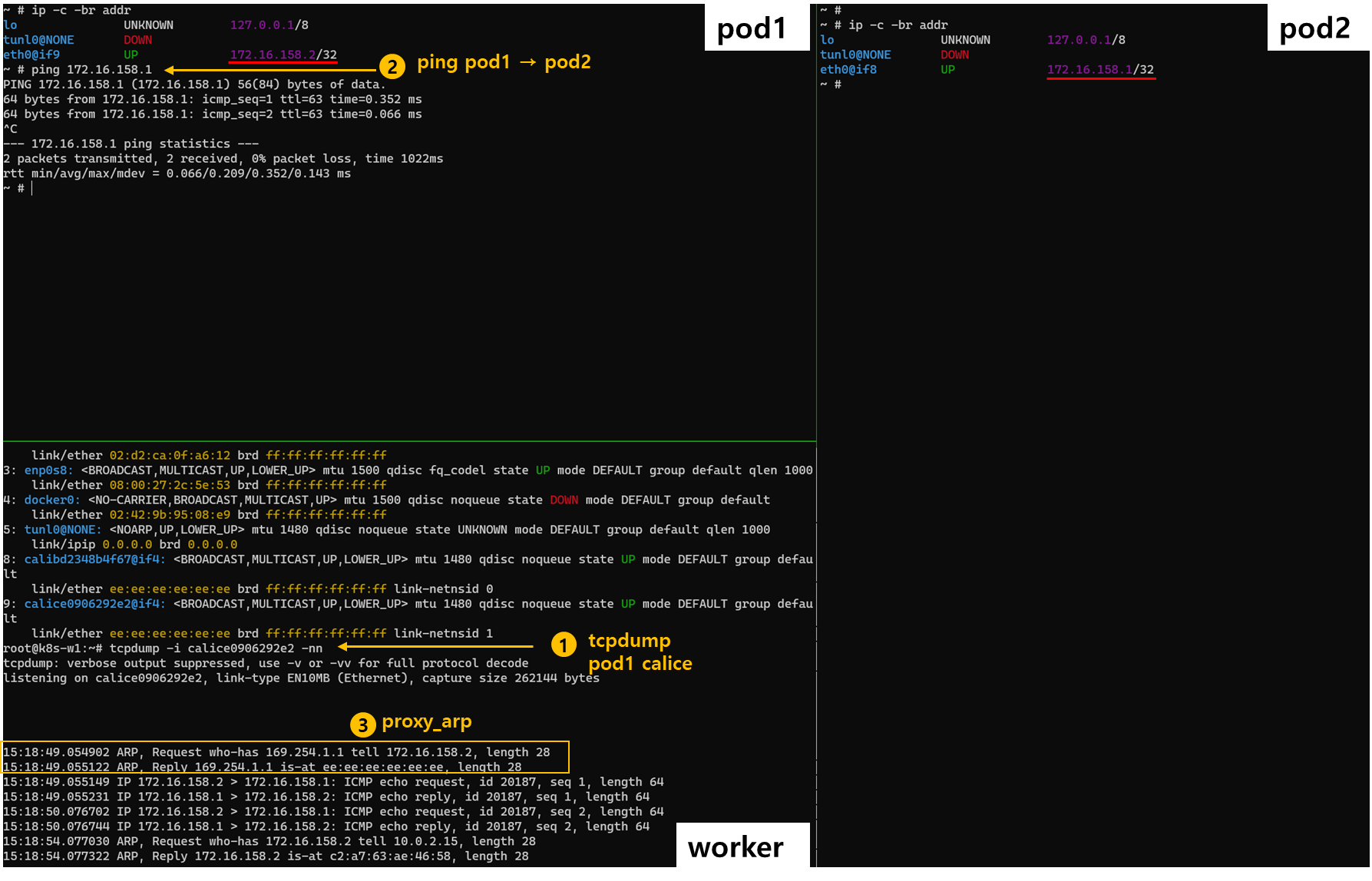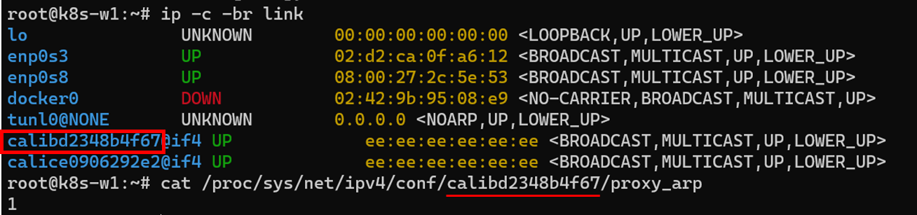 proxy_arp는 각 노드에 리눅스 커널 파라미터로 설정되어 있습니다. 커널파라미터 설정은 calice인터페이스마다 존재합니다. proxy_arp를 비활성화 하면 pod간 통신은 되지 않습니다.