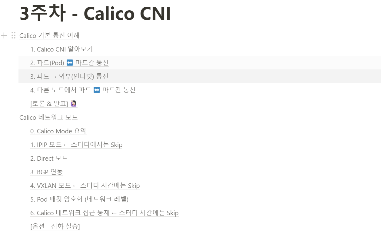3주차 첫번째 주제는 calico 컨셉과 pod통신 이해입니다. 스터디 진행 목차는 아래 그림과 같습니다.