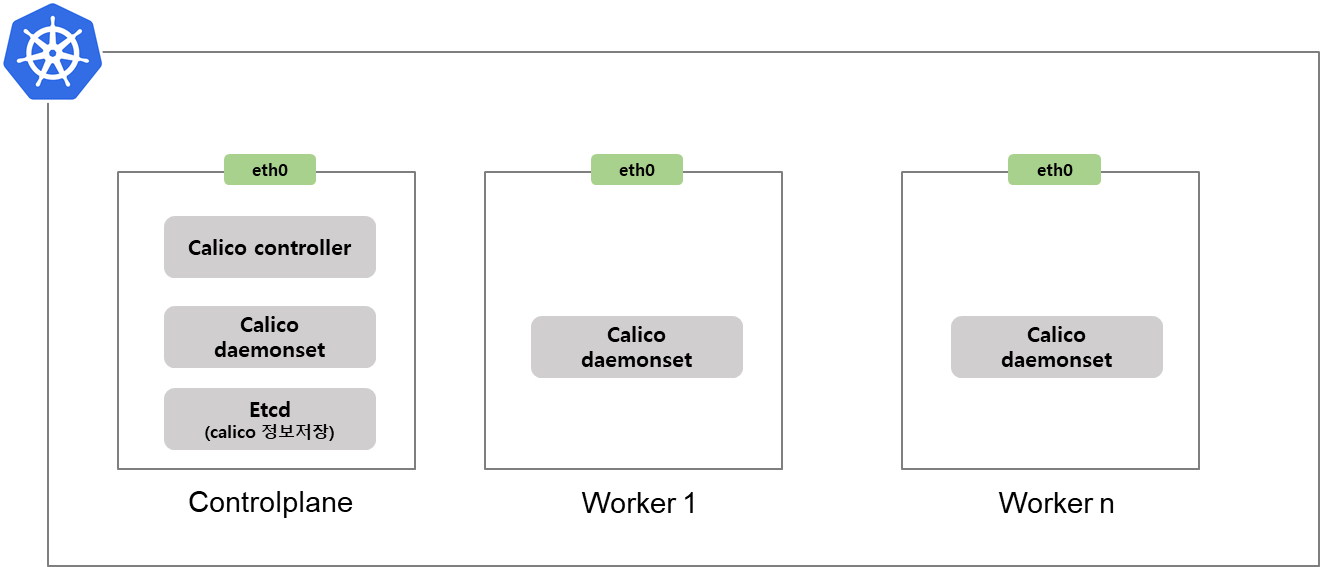 - 컴퍼넌트 목록: Calico API server, Felix, BIRD, confd, Dikastes, CNI plugin, Datastore plugin, IPAM plugin, kube-controllers, Typha, calicoctl