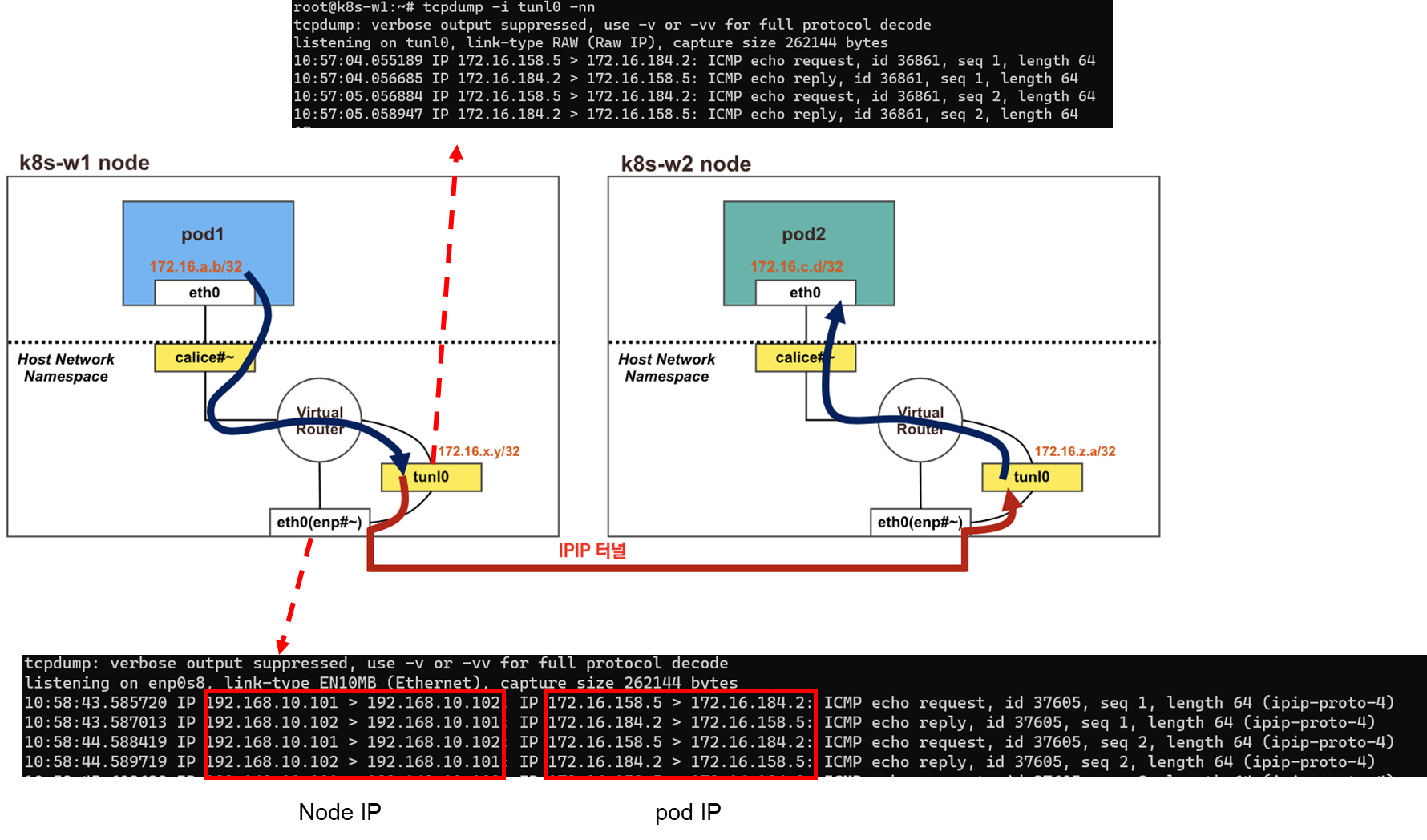 tunl인터페이스와 enp0s3에 tcpdump를 실행한 후, pod1->pod2 ping 명령어를 실행합니다. tcpdump결과에서 pod간 통신 내용을 볼 수 있습니다.