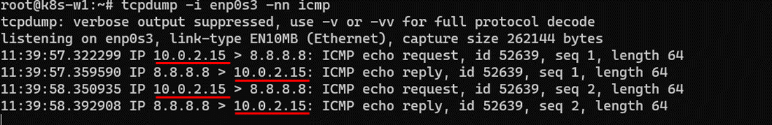그리고 pod1에서 google(8.8.8.8)로 ping을 실행합니다. MASQUERADE설정때문에 구글로 호출하는 IP가 변경된 것을 확인할 수 있습니다. enp0s3 IP가 10.0.2.15입니다.