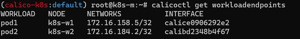 pod가 어떤 calice인터페이스를 사용하는지 calicoctl로 확인할 수 있습니다.아래 예제에서는 pod1, pod2이름을 갖는 pod가 사용하는 calice인터페이스 정보를 출력합니다.