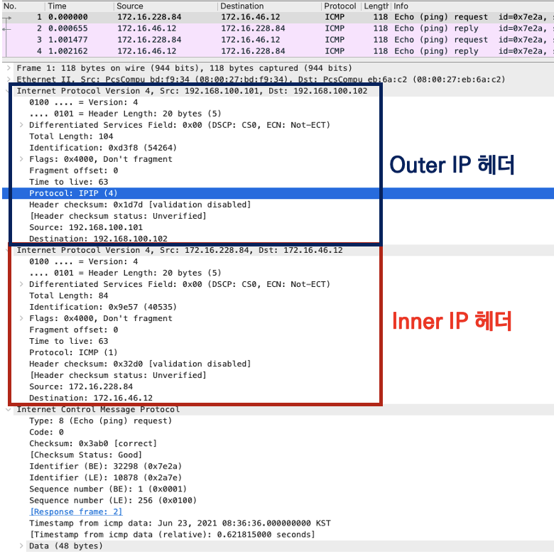 tcpdump결과를 파일로 덤프를 뜨고 wireshark로 확인해봅시다. calico 디폴트 모드인 IPIP모드는 IP헤더에 노드IP, pod IP가 있습니다. node IP정보가 있는 헤더를 Outer IP, pod IP정보가 있는 헤더를 Inner IP헤더라고 합니다.
