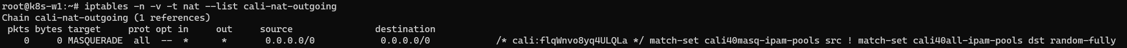pod는 외부와 통신할 때 iptables MASQUERADE설정을 사용합니다. calico가 설치되면 각 노드는 MASQUERADE와 기타 iptables, route 설정을 합니다.
