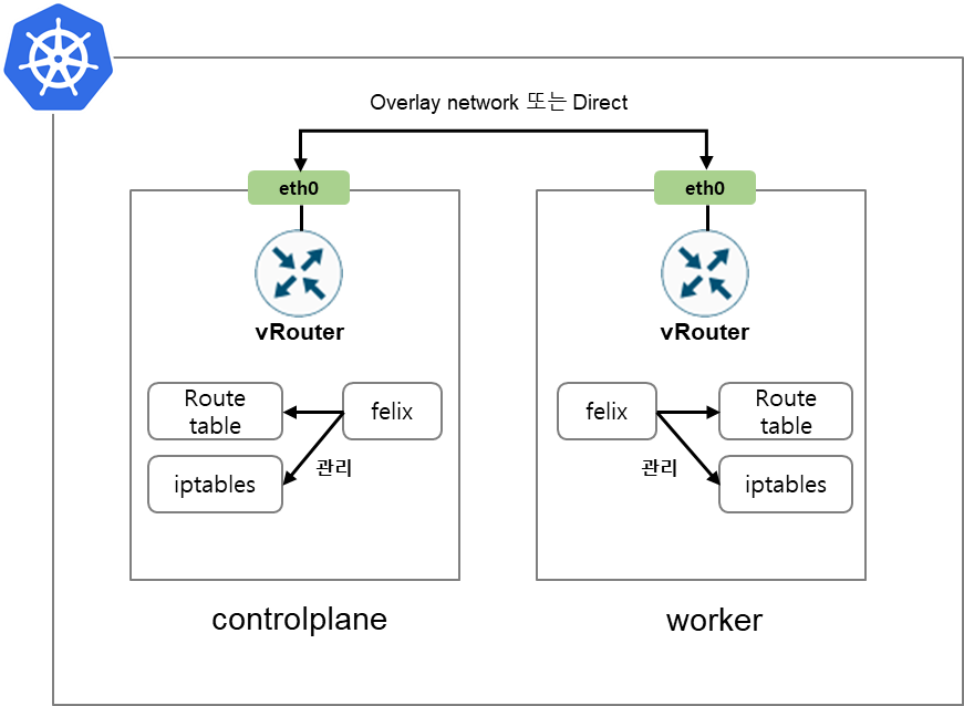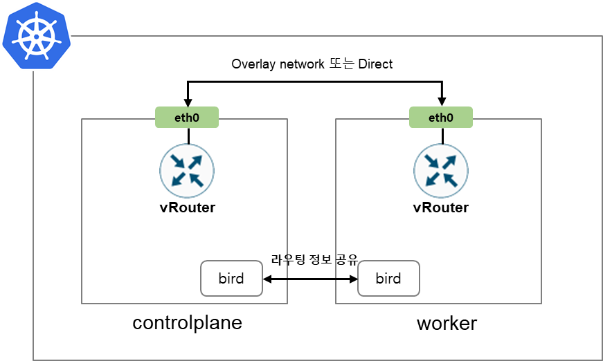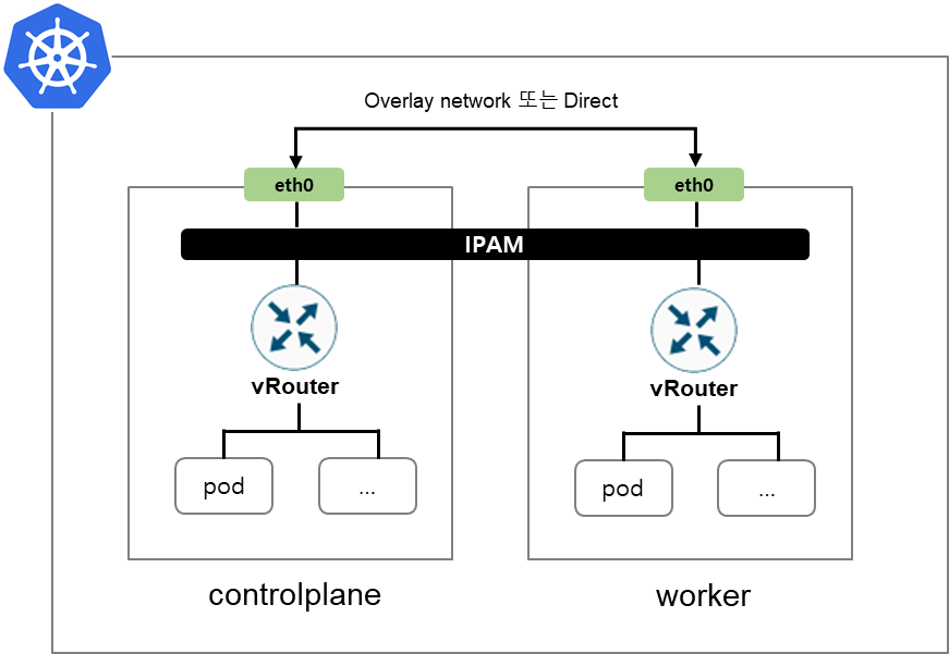 Calico 컨셉은 vRouter(가상 라우터)를 구현하고 BGP프로토콜을 이용하여 라우팅 정보를 공유합니다. 그리고 공유한 라우팅 정보를 이용하여 pod, service 네트워크 통신을 수행합니다. 외부 pod통신은 overlay 또는 Direct로 통신합니다.