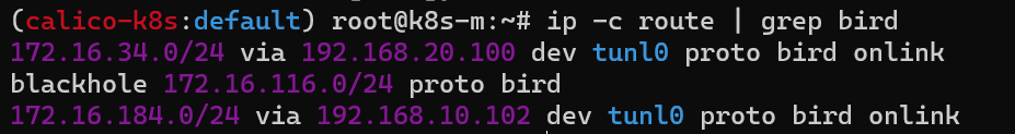 라우팅 테이블을 보면 다른 노드와 통신할 때 tunl인터페이스를 사용하는 것을 볼 수 있습니다. 라우팅 정보는 bird컴퍼넌트가 담당하고 있기 때문에 bird키워드로 필터링 했습니다.