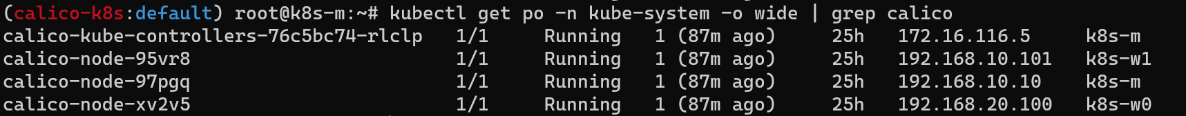 calico pod는 kube-system 네임스페이스에 있습니다. kube-controller와 node pod가 보입니다.
