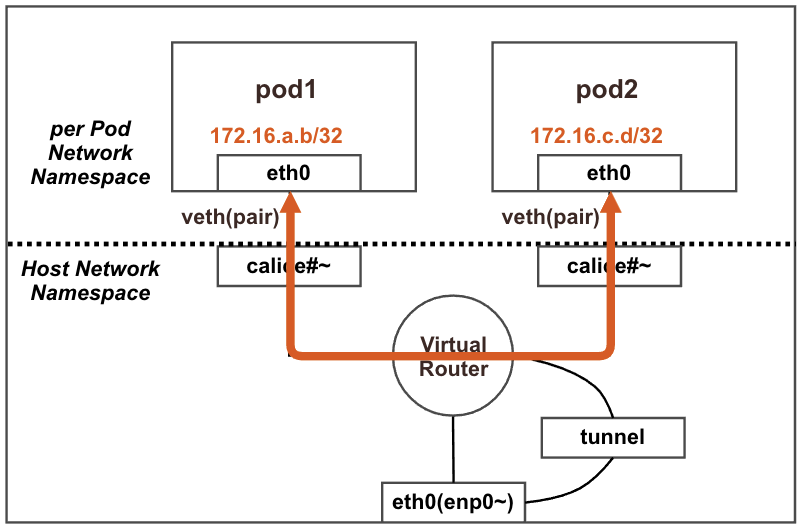 pod1에서 pod2통신을 하기 위해서 각 pod eth0, calice인터페이스와 vRouter를 사용합니다