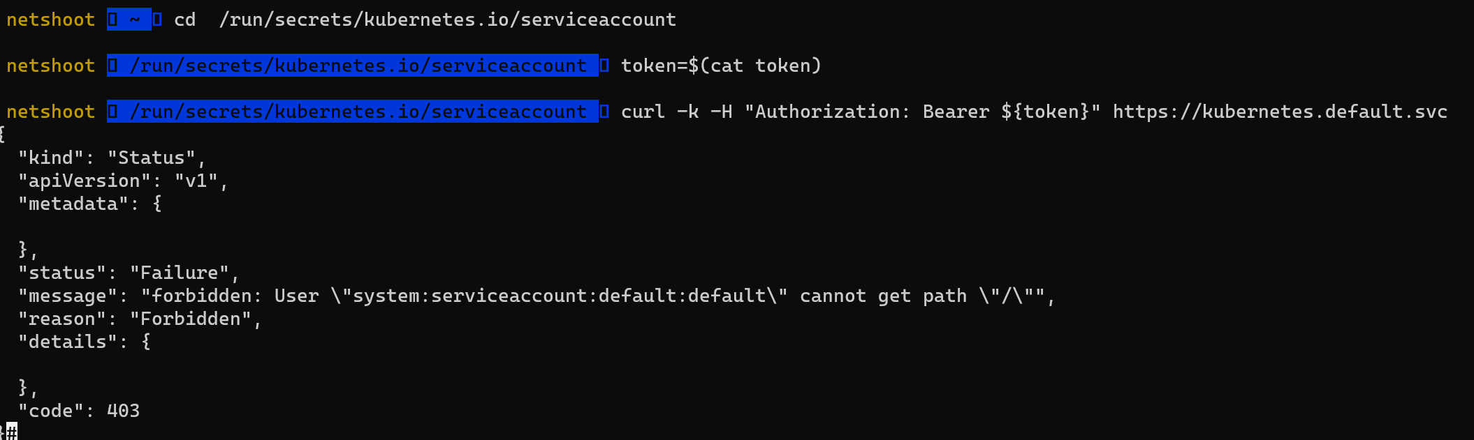 curl 명령어로 kube api server에 요청을 날립니다. default serviceaccount은 아무 권한도 없기 때문에 forbidden응답을 받습니다.