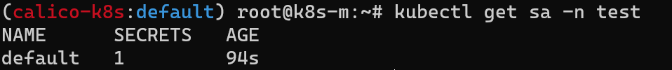 namespace를 생성하면 자동으로 default serviceaccount가 생성됩니다. namespace를 생성하고 약 1분뒤에 serviceaccount를 조회하면 default serviceaccount가 보입니다.