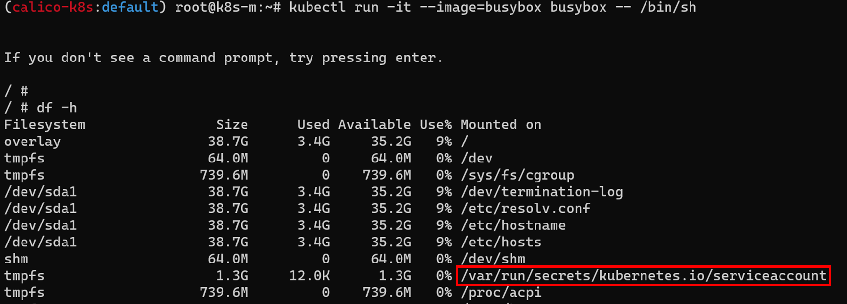 busybox를 pod로 실행 한 후, 마운트 목록을 확인하면 serviceaccount 디렉터리가 보입니다.