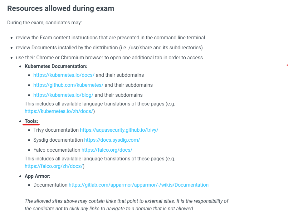 CKA, CKAD시험과 다른 점은 보안 도구를 사용하는 문제가 있습니다. 보안도구는 미리 설치되어 있지만 쿠버네티스 공식문서를 보면서 보안도구를 사용할 수 있어야합니다. CKS에서 사용하는 보안도구 목록은 시험 가이드 문서에 설명되어 있습니다.