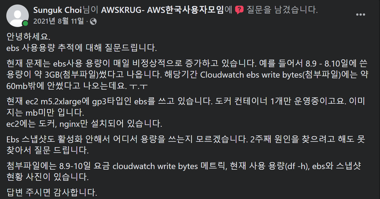 제일 기억에 남는 요금계산은 EBS볼륨이었습니다. 매일 EBS요금이 늘어나고 원인을 못찾아서 페이스북 "AWS한국사용자모임"에도 질문을 하여 해결했습니다. EBS볼륨은 언제나 타입을 변경할 수 있고 용량도 변경할 수 있어서 핸드폰 요금처럼 일일사용량에 대해 계산이 됩니다!.