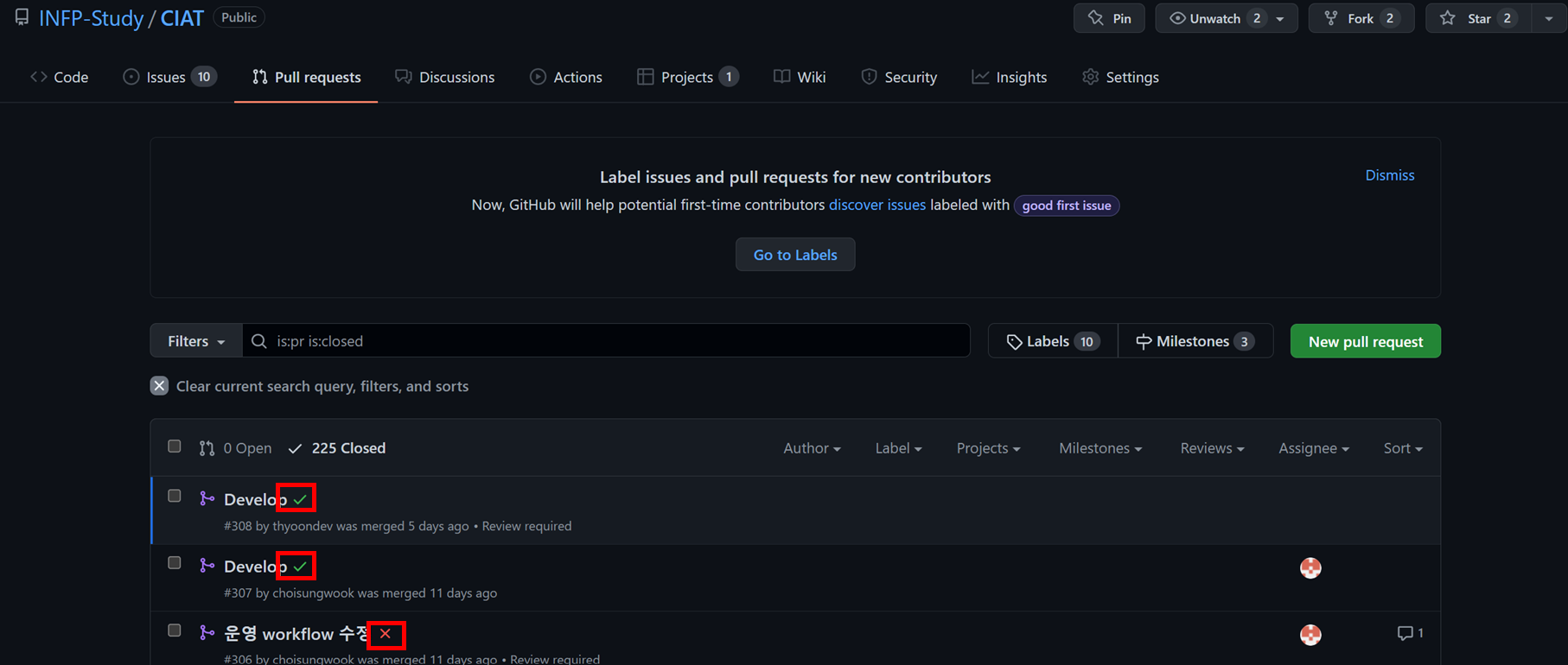 pull requests목록에서도 github action결과가 보입니다. github자체가 지원하는 기능이다보니 jenkins보다 훨씬 편의성이 좋습니다.