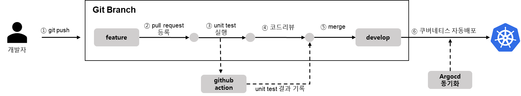 argocd와 github action 연동의 가장 큰 어려운 점은 새로운 도커 이미지가 push되면, argocd가 바라보는 git에 내용을 업데이트 할까였습니다. argocd는 git의 내용이 업데이트가 되야 쿠버네티스 배포를 시작합니다. 저의 의도는 도커 이미지가 push되면이여서 argocd전용 브랜치를 하나 생성했습니다.