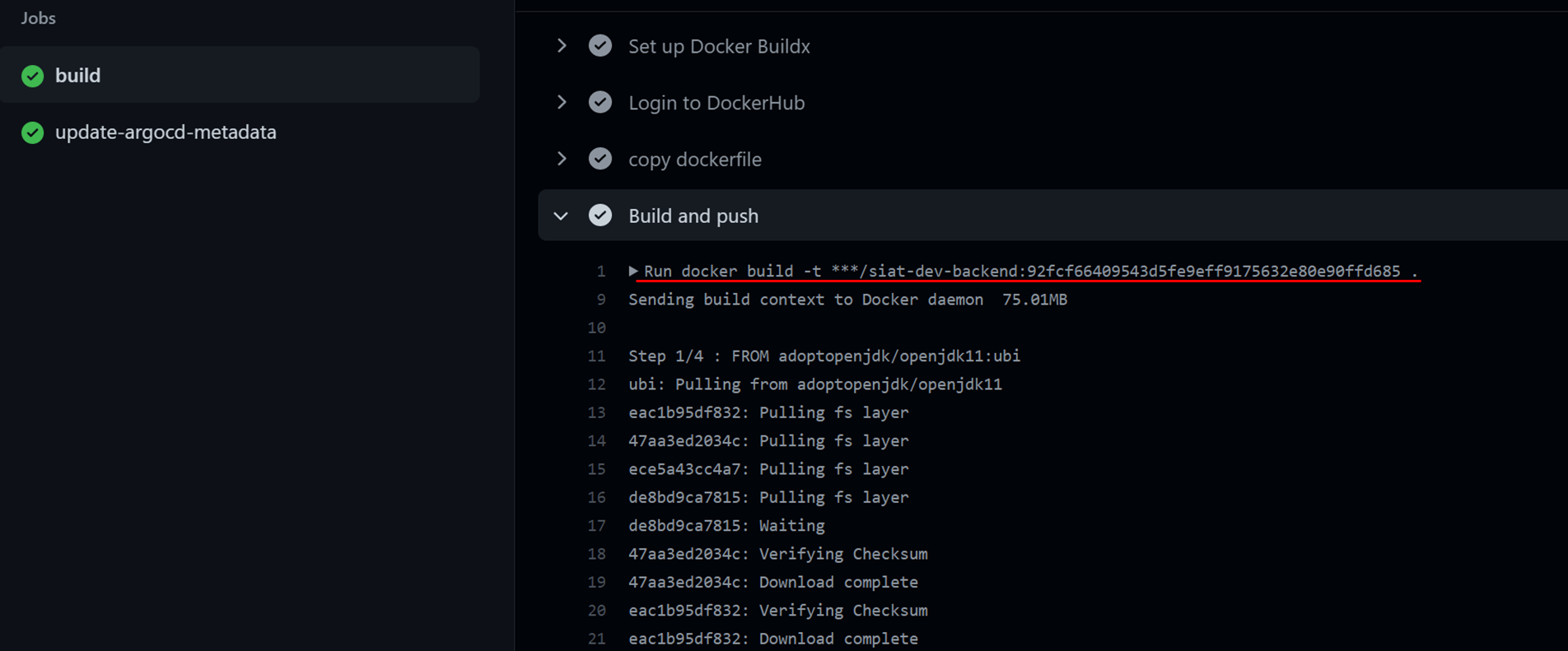 빌드는 총 3단계로 진행됩니다. 프로젝트 빌드, 도커 이미지 빌드와 push, argocd 메타정보 업데이트입니다. 프로젝트 빌드와 도커 이미지 빌드는 한 step에 진행됩니다. 백엔드는 gradle, 프론트엔드는 yarn(미구현) 프로젝트를 빌드합니다. 빌드된 결과물을 도커이미지로 생성하고 도커 registry에 push합니다.
