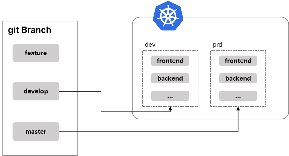 형상관리는 github으로 관리했습니다. dev, prd 환경을 구분하기 위해 브랜치를 이용했습니다. develop브랜치는 dev namespace에 master브랜치는 prd namespace에 배포됩니다.