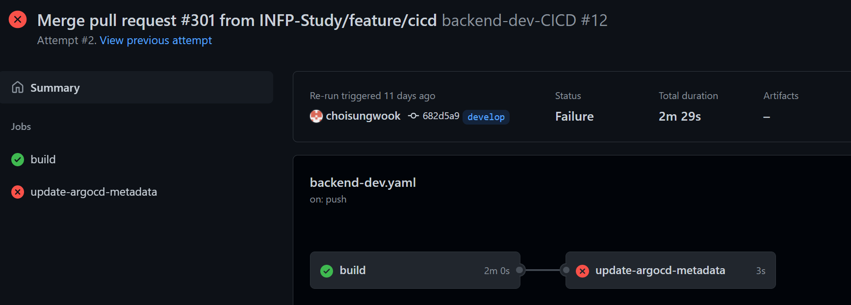 빌드과정의 오류도 파이프라인 구축 지식이 없이 쉽게 확인할 수 있습니다. 아래 예제에서는 argocd배포 과정이 오류가 생겼네요.