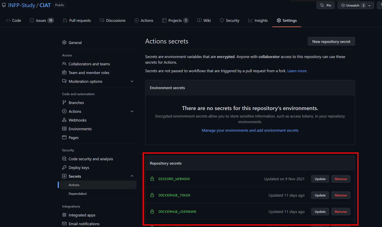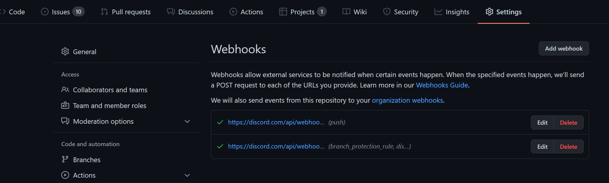 github은 settings페이지에 들어가서 입력만 하면 됩니다. 이것만 봐서는 jenkins와 다를게 없어보이는데요. settings에 들어가기 위한 인증/인가를 별도로 설정하지 않아도 됩니다. github이 알아서 해줘요!.