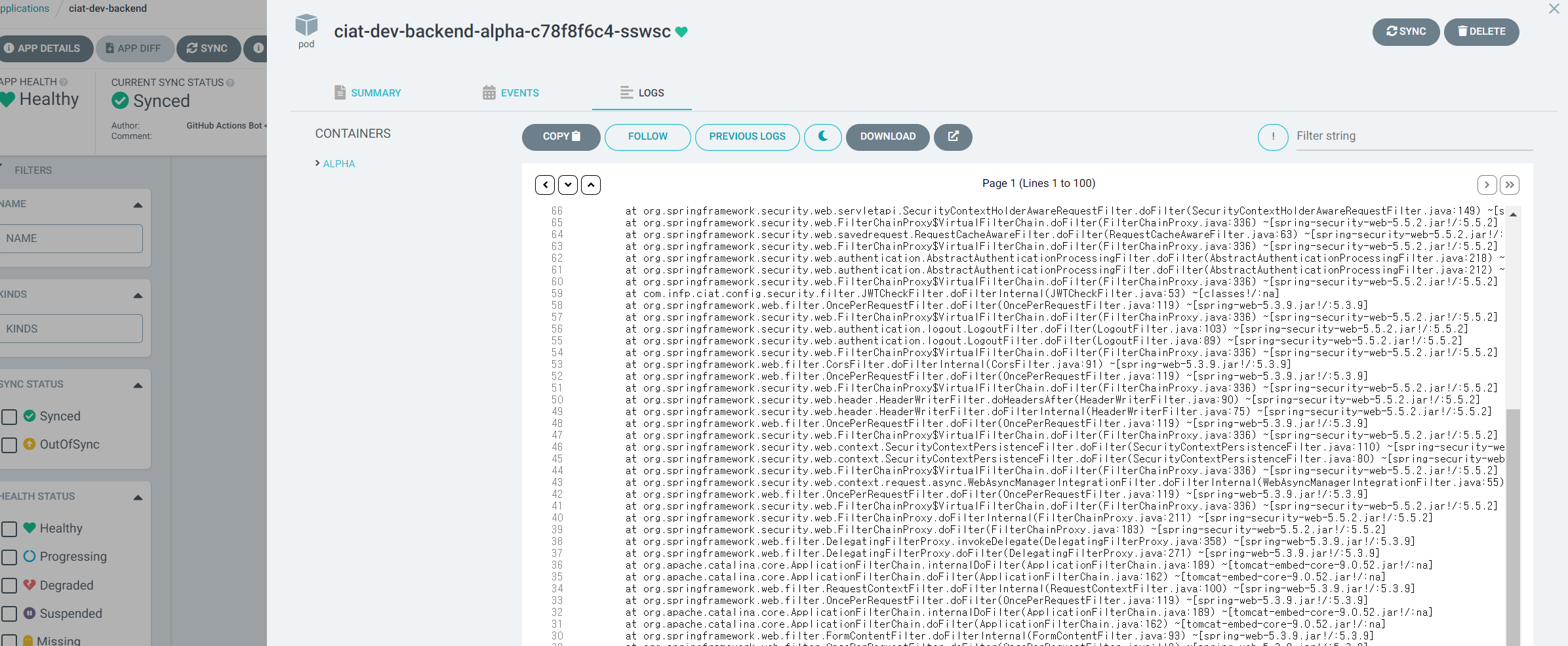 ② argocd가 점점 발전하는게 보였습니다. 이 프로젝트에 사용한 argocd는 컨테이너 로그 뷰어와 다운로드기능이 추가되었습니다.