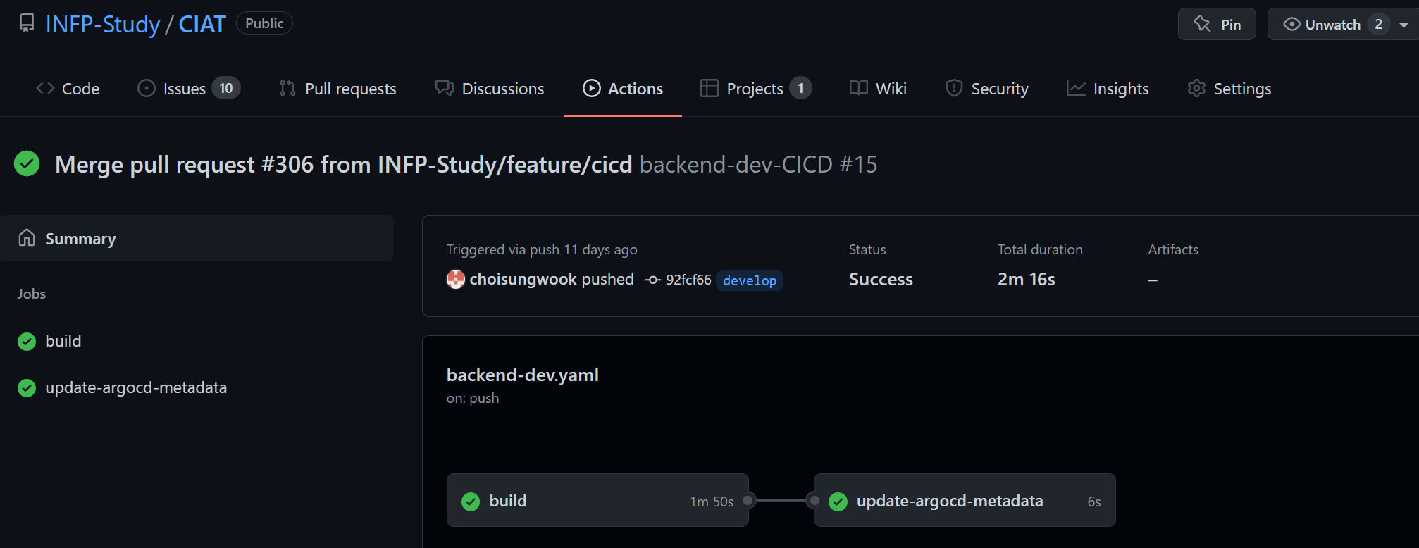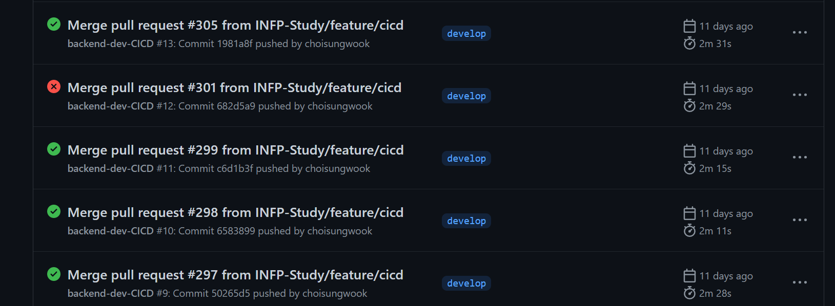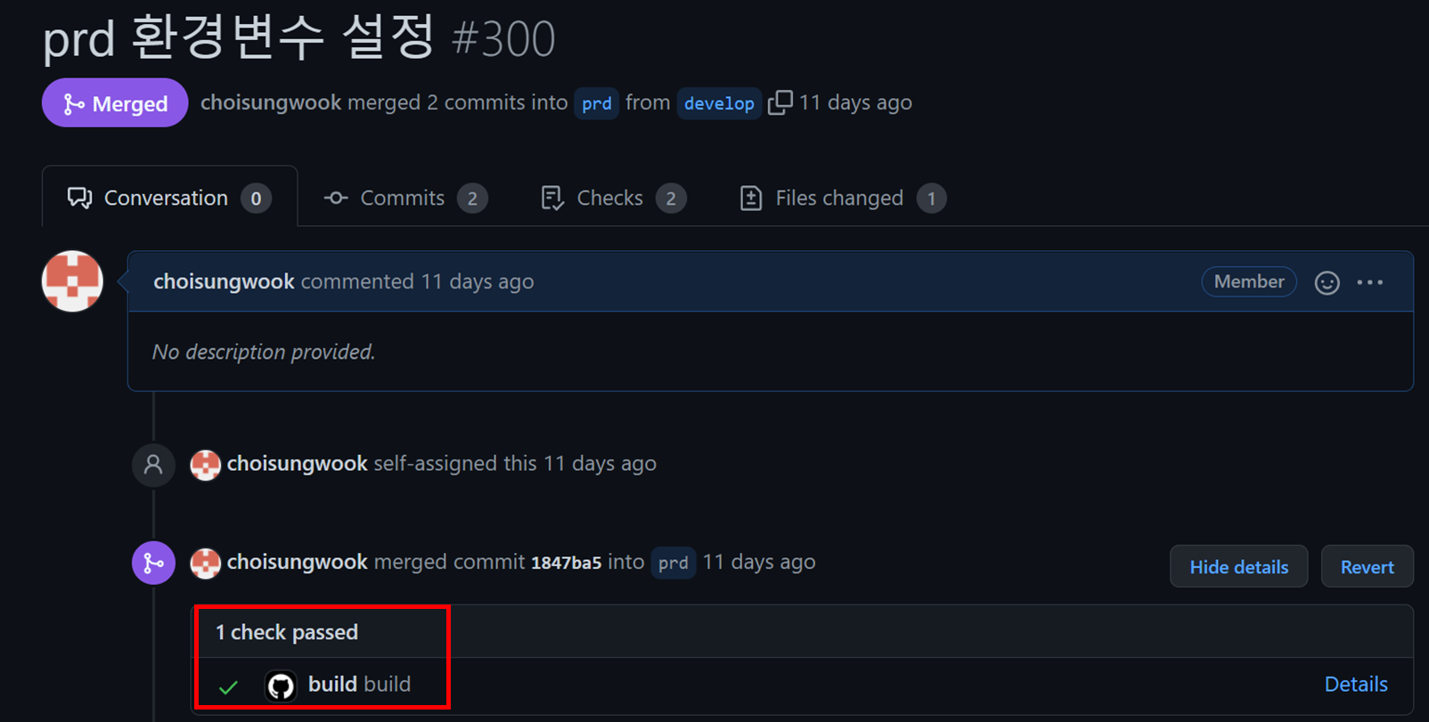 리뷰어가 merge를 수락하면 프로젝트 빌드가 수행됩니다.