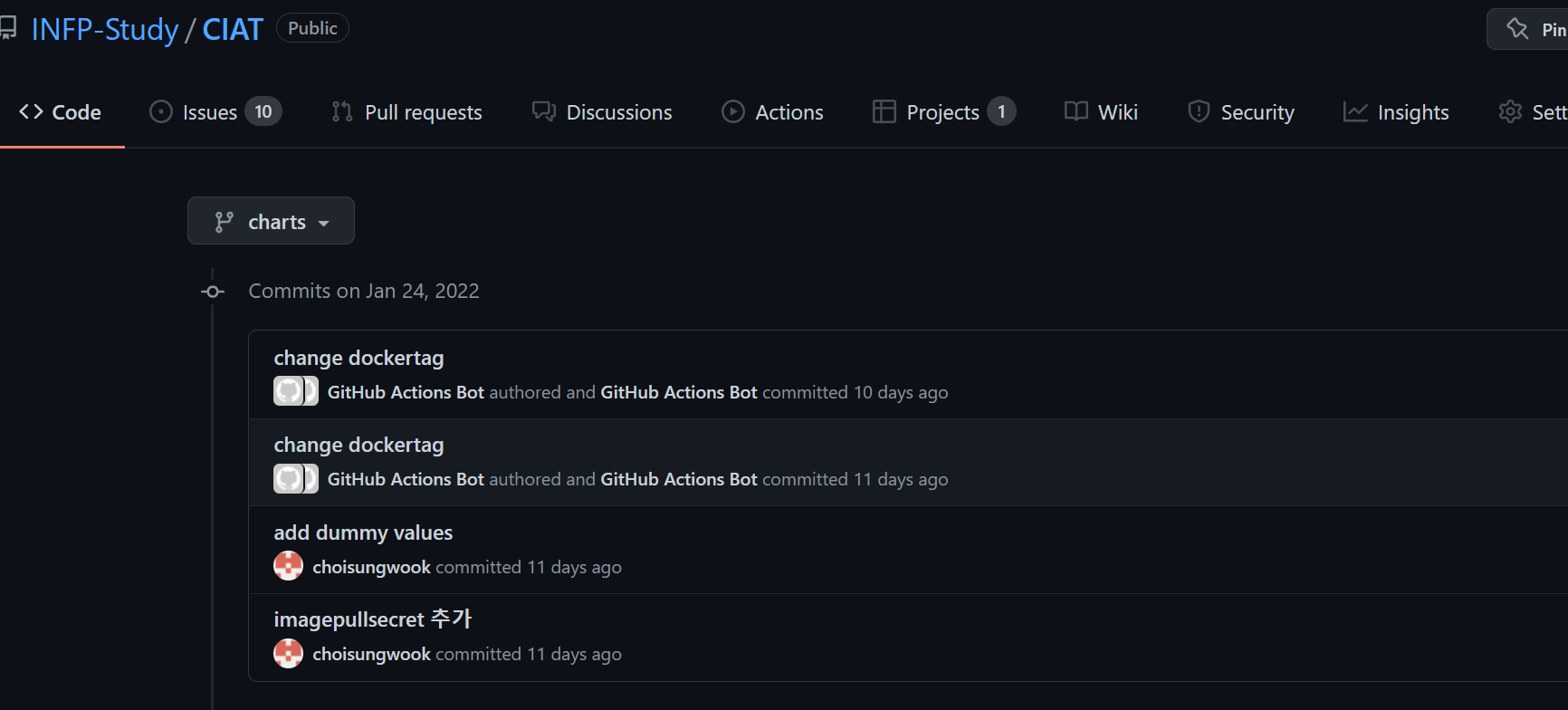 argocd는 charts라는 별도의 브랜치를 바라봅니다. charts의 내용이 업데이트 되면 argocd는 자동으로 쿠버네티스 리소스를 업데이트 합니다.