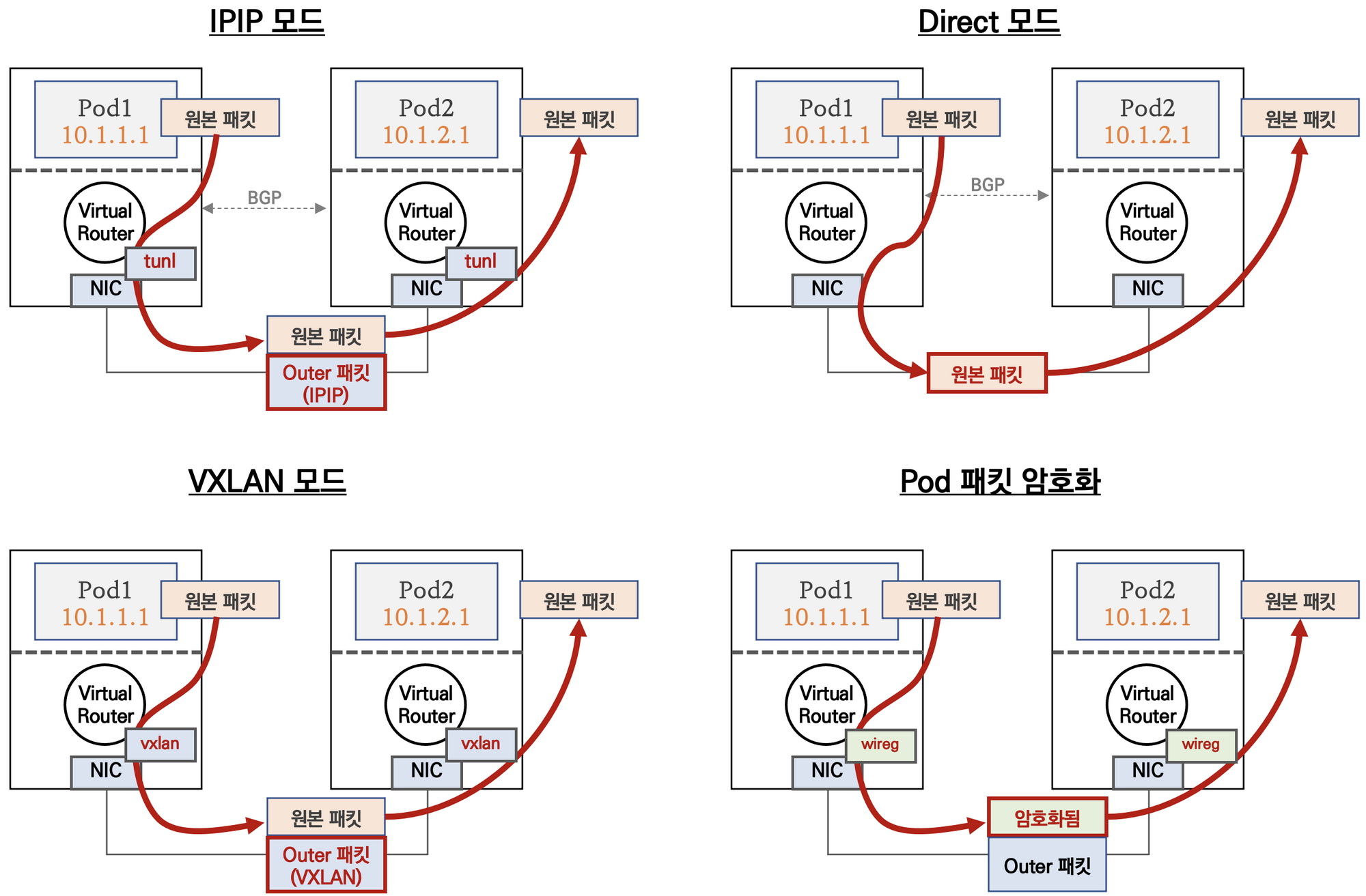 calico는 쿠버네티스 네트워크 통신 제어를 4가지 모드를 동작합니다. 디폴트는 IPIP모드입니다. 아래 그림은 다른 노드에 있는 pod끼리 통신할 때 각 모드 동작입니다. IPIP모드는 Azure클라우드에서 동작하지 않습니다.