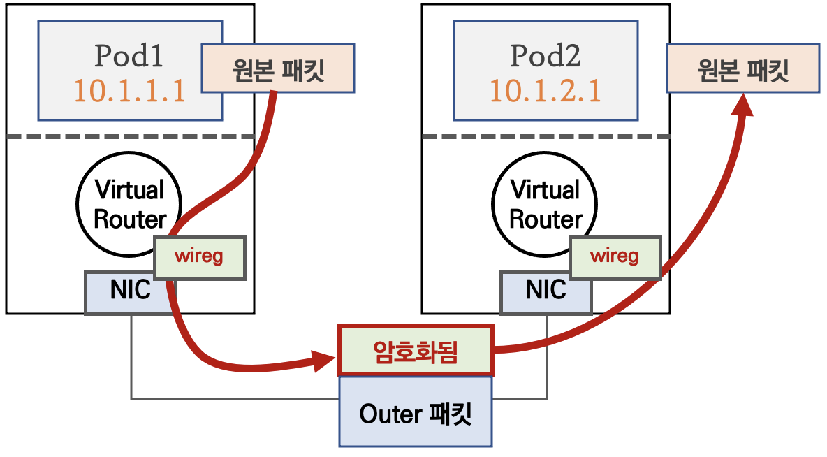 WireGuard모드는 패킷을 암호화하여 통신하는 모드입니다. wireg네트워크 인터페이스가 패킷 암호화/복호화 역할을 담당합니다.