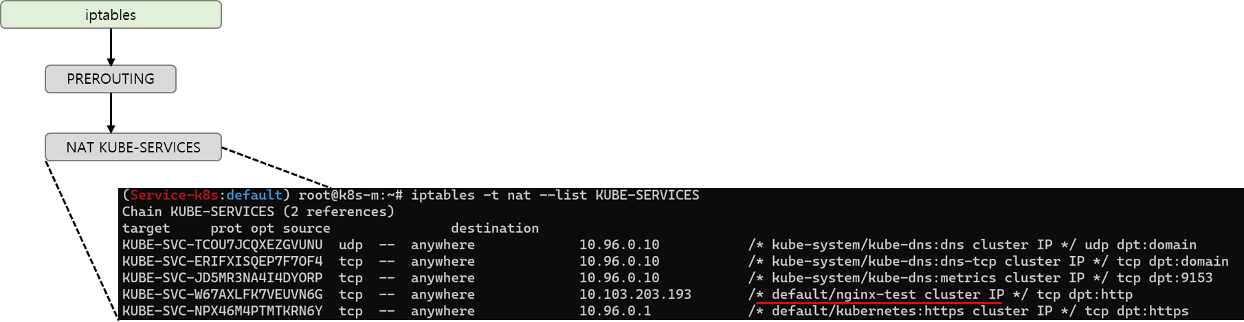 iptables는 처음 들어오는 패킷은 PREROUTING 테이블 규칙을 만납니다. 서비스로 오는 패킷은 KUBE-SERVICES 규칙을 따르게 됩니다.
