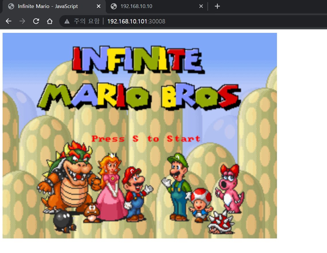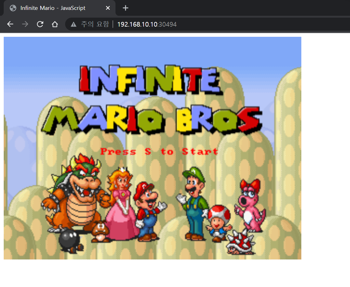 nodeport인 30494포트로 접속했더니 짜잔! 마리오 화면이 나옵니다.