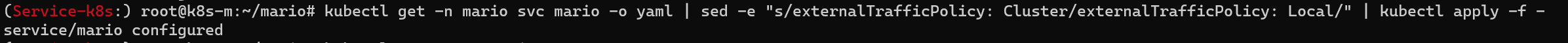 kubectl get -n mario svc mario -o yaml | sed -e "s/externalTrafficPolicy: Cluster/externalTrafficPolicy: Local/" | kubectl apply -f -