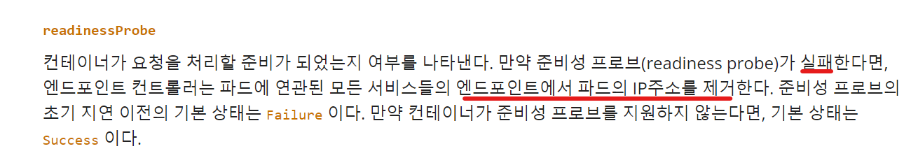 Readiness는 공식문서(https://kubernetes.io/docs/concepts/workloads/pods/pod-lifecycle/#types-of-probe)에서 설명한것 처럼 성공할 때까지 서비스 엔드포인트의 pod IP를 제거하는 특징을 가집니다. 애플리케이션이 처음 실행 될 때 연관관계를 갖게할때 매우 유용하게 사용할 수 있습니다.